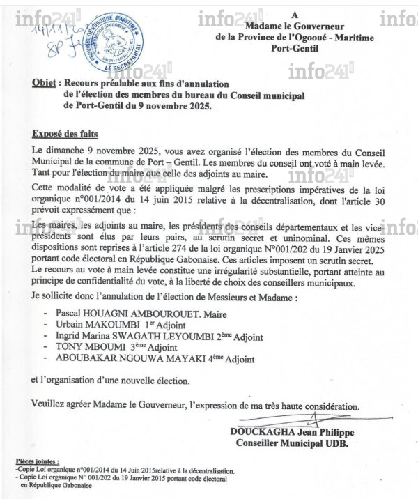 Au cœur de la contestation se trouve Jean-Philippe Douckagha, conseiller municipal de l’Union démocratique des bâtisseurs (UDB), formation politique dont pourtant est issue le nouveau maire. Dans un recours daté de ce vendredi 14 novembre et adressé au gouverneur de l’Ogooué-Maritime, il dénonce une « violation flagrante » de la loi. Selon lui, le vote à main levée utilisé pour la désignation de Pascal Houangni Ambourouet, désormais proclamé maire, et de ses adjoints, est contraire aux exigences légales relatives à la confidentialité et à la liberté du vote.