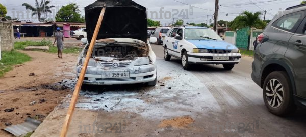 Port-Gentil : Un taxi prend feu en pleine circulation obligeant ses occupants à la fuite !