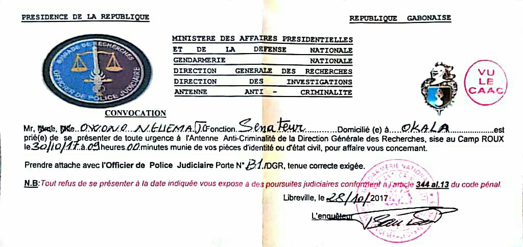 Ladite convocation policière a été remise au vice-président du Sénat alors que celui-ci animait une conférence de presse à Libreville sur la nécessité de contrer le projet de reforme du régime de Libreville. L’opposant a déclaré au cours de la même conférence de presse conjointe avec Jean de dieu Moukagni Iwangou, qu’il ne se rendra pas à la convocation de la DGR.