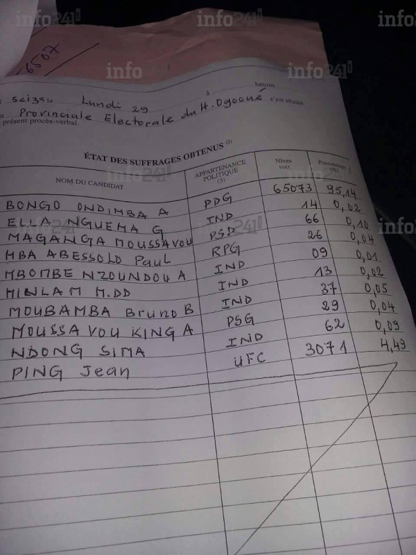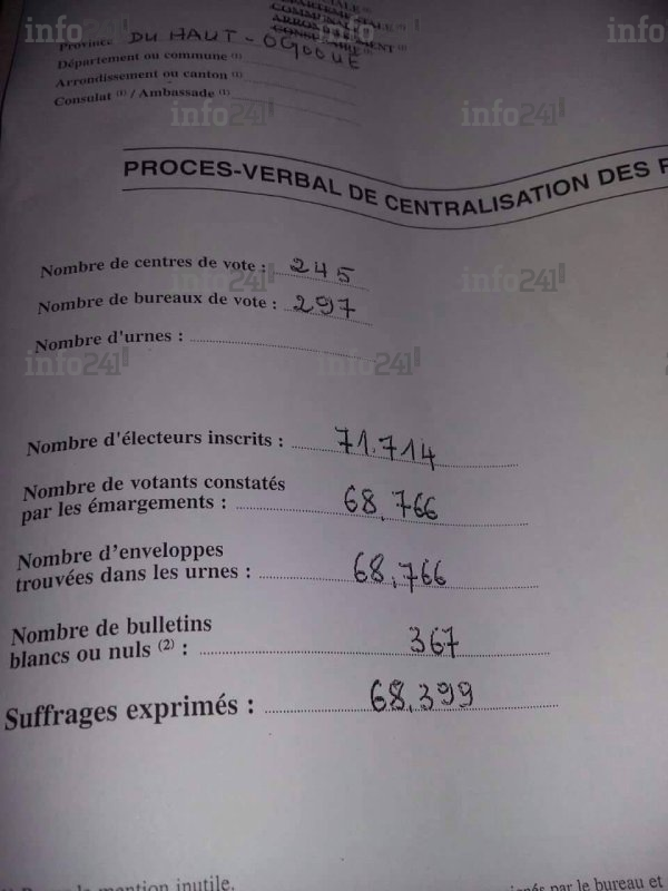 Mais seule ombre au tableau, lorsqu’on regarde de plus près les résultats salvateurs du Haut Ogooué notamment le procès-verbal de centralisation des résultats de cette province, on est surpris de constater que le nombre d’électeurs inscrits est supérieur à celui de la liste électorale officielle du Ministère de l’Intérieur du Gabon soit 71.714 pour le Procès-Verbal (doc. Procès verbal 1 et 2) contre 71123 pour la liste électorale biométrique dite « projet iboga » (page 457 doc Liste CENAP).