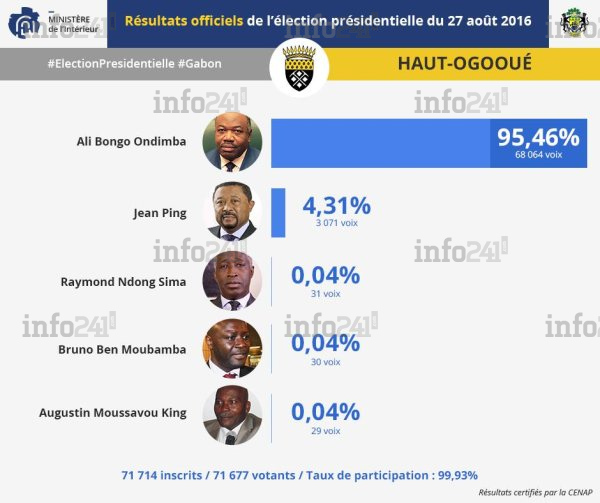 Jusqu’au 30 août 2016, seuls les résultats de la province du Haut Ogooué n’étaient pas communiqués alors que le dépouillement avait été effectué le 27 août dans la soirée. Sans les résultats du Haut-Ogooué qui n’étaient pas communiqués alors que tous les autres étaient connus, Jean Ping était en avance d’un peu plus de 60.000 voix, mais c’était sans compter sur les talents avérés de faussaire de son adversaire.
