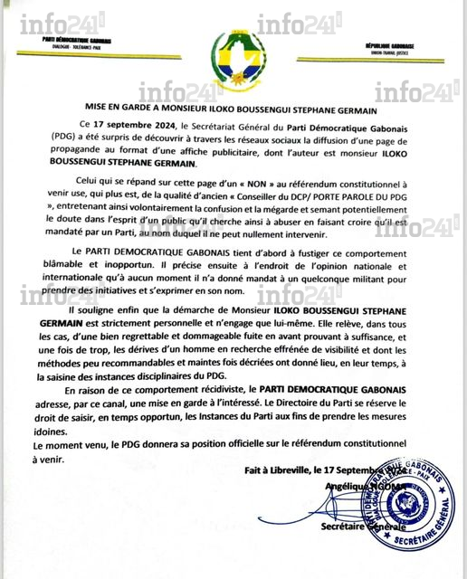 Le PDG se désolidarise totalement de la démarche de cet ancien conseiller d’Ali Bongo, déchu à la fois de la tête du pays et du parti. « La démarche de Monsieur Iloko Boussengui Stéphane Germain est strictement personnelle et n’engage que lui-même », tente de désamorcer Angélique Ngoma pour rester dans les bonnes grâces des nouvelles autorités. Elle souligne également une « fuite en avant prouvant à suffisance, et une fois de trop, les dérives d’un homme en recherche effrénée de visibilité ».