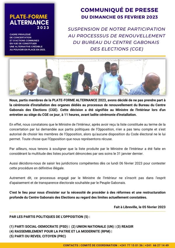Et d’expliquer : « Nous, partis membres de la PLATE-FORME ALTERNANCE 2023, avons décidé de ne pas prendre part à la cérémonie d’installation des organes dédiés au processus de renouvellement du Bureau du Centre Gabonais des Elections (CGE). Cette décision a été signifiée au Ministre de l’Intérieur lors d’un entretien au siège du CGE ce jour, à 11 heures, avant ladite cérémonie d’installation ».