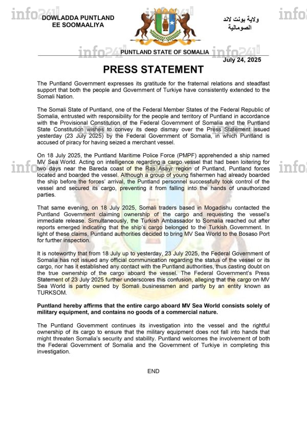 Les autorités du Puntland, région semi-autonome du nord-est de la Somalie, ont annoncé ce jeudi avoir intercepté le navire Sea World, transportant un important chargement de matériel militaire. Dans un communiqué de presse, elles précisent que les forces de la police maritime sont montées à bord du navire le 18 juillet, avant de l’acheminer vers le port de Bosasso pour des vérifications complémentaires.