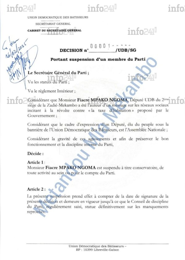 Cette fermeté est directement liée au ton employé par l’élu de la Zadié dans une publication devenue virale. Dans ce message, Fiacre Mpako Ngoma dénonçait la taxe d’habitation comme une « loi injuste, pensée par les ennemis du peuple » et l’attribuait à « ceux qui, tapis dans l’ombre, n’ont jamais vécu la réalité du peuple gabonais  ». Des propos jugés inacceptables pour une formation qui porte la politique fiscale du gouvernement, en pleine controverse nationale autour de la TFH.