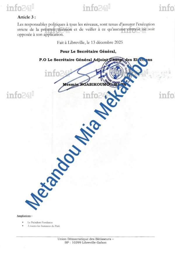 La décision comporte trois articles particulièrement explicites. Le premier suspend Fiacre Mpako Ngoma « à titre conservatoire de toute activité au sein ou pour le compte du parti ». Le deuxième précise que la mesure demeure valable jusqu’à ce que le conseil de discipline se prononce « définitivement sur les manquements reprochés ». Le troisième enjoint tous les responsables politiques de l’UDB, « à tous les niveaux », d’assurer l’exécution stricte de cette décision et de veiller à ce qu’«  aucune entrave ne soit opposée à son application ». Le document est adressé en ampliation au président fondateur du parti et à l’ensemble de ses instances.