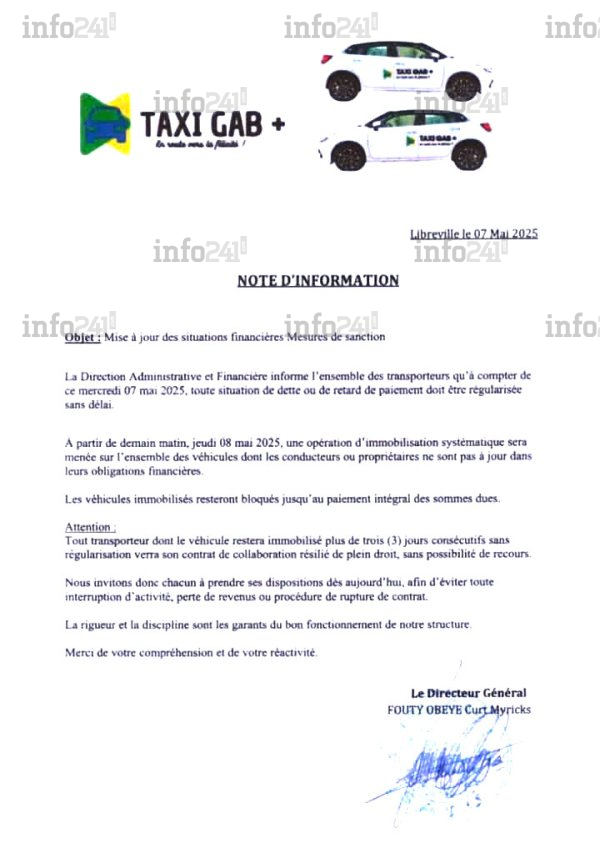 Taxi Gab+ : Faute de paiement, les chauffeurs menacés de saisie et de rupture de contrat © 2025 D.R./Info241