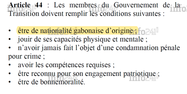 Sauf que pour faire partie du gouvernement, il faut être gabonais d’origine. Une condition que ne remplirait aucunement Laurence Ndong Mbazogo épouse Ndong, selon ses détracteurs. Ceux-ci dont le journaliste en exil Jonas Moulenda, affirment qu’elle est bien née de père et de mère camerounais. Une violation de la charte de la transition en son article 44 que devrait clarifier les nouvelles autorités gabonaises qui ont déjà maille à partir avec la nomination aux Mines du sulfureux Hervé Patrick Opiangah.
