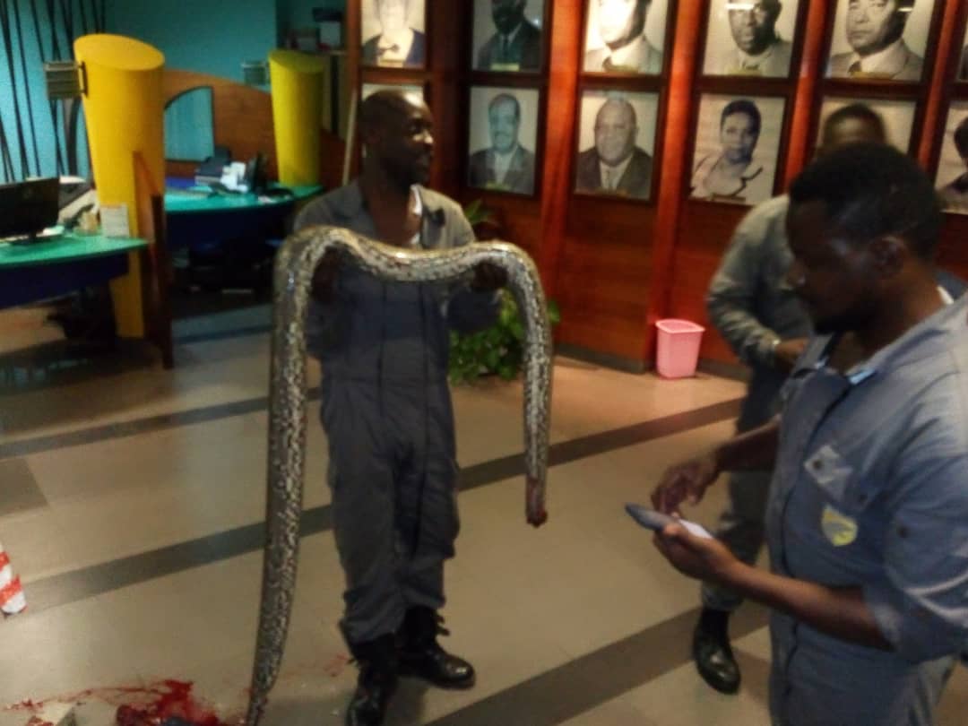 Grosse frayeur ce mercredi matin pour les salariés du siège social de la Caisse nationale de sécurité sociale (CNSS) du Gabon. Un python de plusieurs mètres a été retrouvé par des vigiles dans le hall de l’entreprise publique située à Libreville. Rapidement mis hors d’état de nuire, comme le montré ces clichés, le nuisible a tout de même plongé les employés et les riverains dans la stupeur. Que faisait-il là ? Y était-il depuis des lustres ? That is the question !