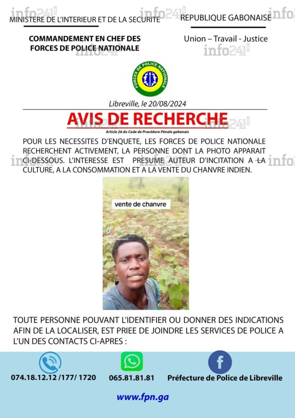 Les autorités rappellent que ces pratiques sont strictement prohibées sur l’ensemble du territoire national. « Les forces de police nationale recherchent activement la personne dont la photo apparaît ci-dessous. L’intéressé est présumé auteur d’incitation à la culture, à la consommation et à la vente de chanvre indien », indique l’avis de la police. Même si la vidéo avait pour objectif de créer du buzz sur les réseaux sociaux, cette action reste passible de poursuites en vertu de l’article 26 du Code de procédure pénale gabonais.