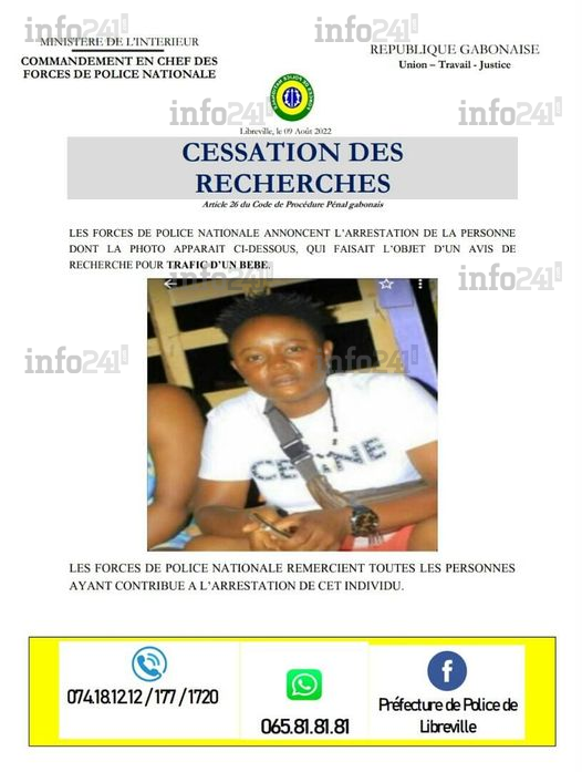 Dans leur avis de recherche, les autorités policières gabonaises indiquaient : « Pour des nécessités d’enquête, les forces de police nationale recherchent activement la personne dont la photo apparaît ci-dessous poursuivie pour trafic d’un bébé ». Cette femme était depuis introuvable d’où l’appel lancé par la préfecture de police à « Toute personne pouvant l’identifier ou donner des indications afin de la localiser ».