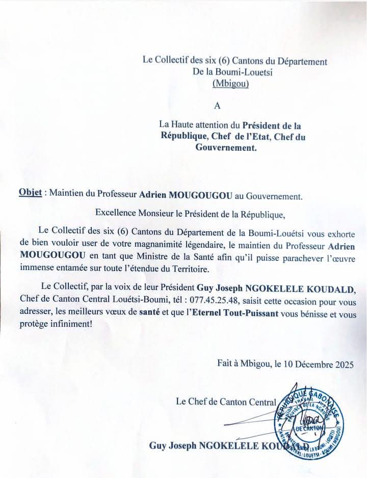 Depuis ce mercredi, la toile gabonaise est heurtée d’un drôle de courrier. Ledit courrier a tout d’une relique de l’ère Bongo, mais il est bien daté du 10 décembre 2025. Signé du « Collectif des six cantons du département de la Boumi-Louetsi (Mbigou) », il est adressé « à la haute attention du Président de la République, Chef de l’État, Chef du Gouvernement ». Objetif affiché : obtenir le « maintien du professeur Adrien Mougougou au gouvernement », ancien leader syndical et fils de cette partie de la Ngounié, alors même que l’intéressé a été élu député du coin et a officiellement quitté de lui-même ses fonctions ministérielles pour rejoindre l’Assemblée nationale.